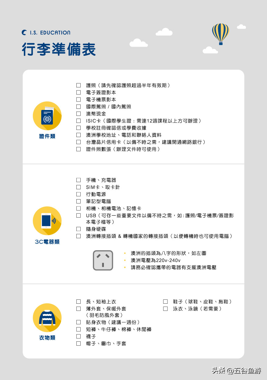 至于行李该如何准备,这边有个台湾博主针对澳洲留学制定的一份行李准备清单可供大家参考: