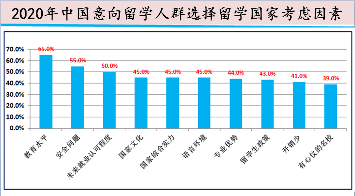 中国留学生选择留学目的地国主要考虑的因素有教育水平,安全问题,未来就业认可程度,国家文化,国家综合实力等。