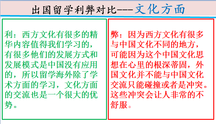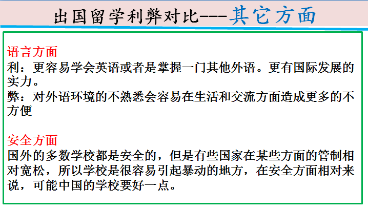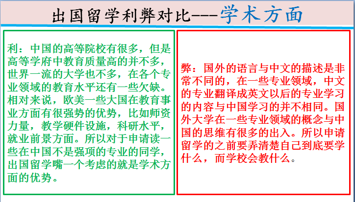 出国留学有很多利弊有很多,以下从学术方面,文化方面,语言及安全方面进行简要分析: