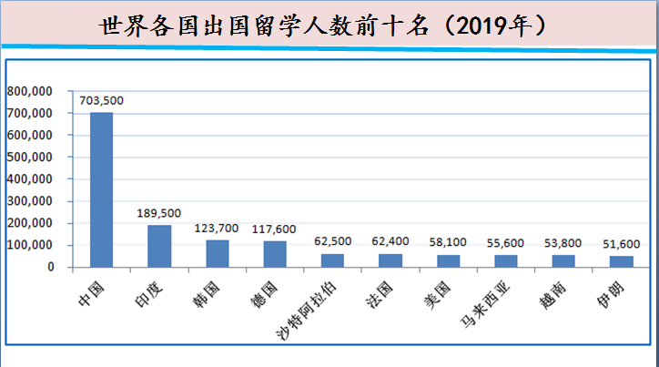 以2019年为例(2020年因新冠疫情原因数据有偏差),中国人出国留学人数70.35万人,位列世界第一,排名第二的印度18.95万人,还不到中国的三分之一;韩国以12.37万人排第3。