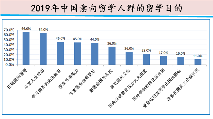 根据调查,目前中国意向留学人群的留学目的,主要是拓展国际视野,丰富人生经历,学习国外的先进知识,提高外语能力,未来就业前景更好。