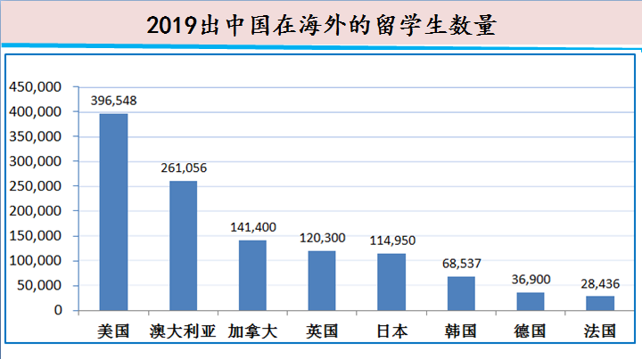 截止2019年,中国留学生在国外分布,排名前三的39.6万人在美国,26.1万人在澳大利亚,14.1万人在加拿大。紧随其后的是英国,日本,韩国,德国,法国。