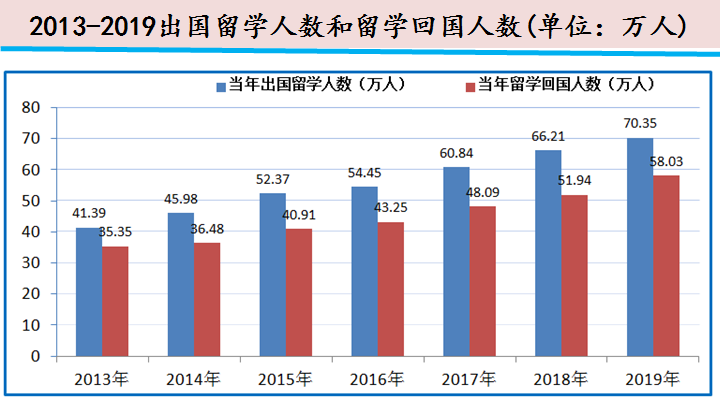 2013年-2019年中国出国留学人数和留学回国人数数据,历年出国留学人数都远超回国人数,以2019年为例,出国留学人数比留学回国人数多12.32万人。