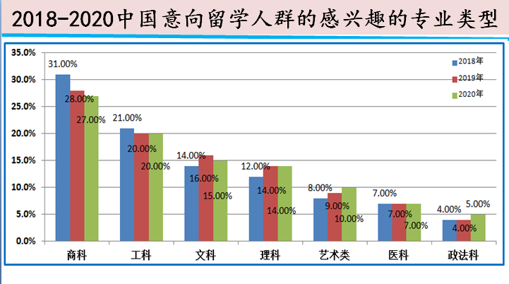 中国出国留学人群感兴趣的专业类型,主要是商科,工科,文科等。