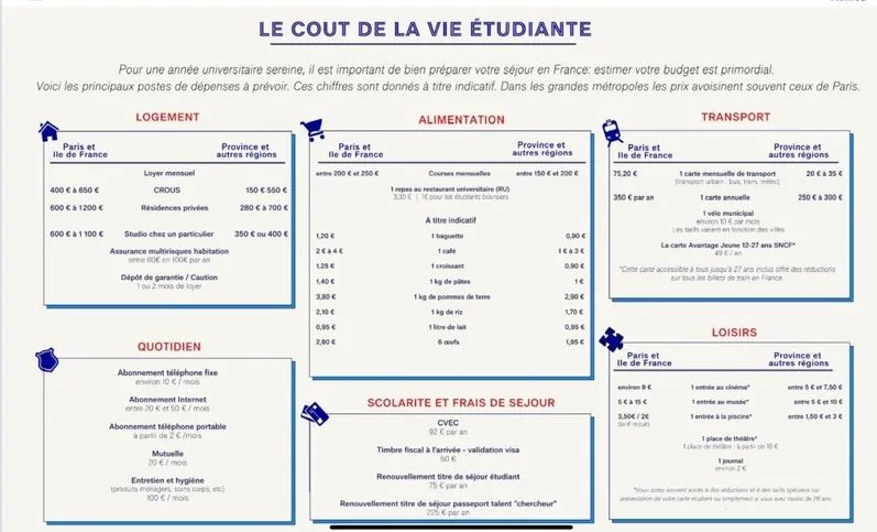如果你准备去法国留学,有一件重要的事情一定不能忽略——提前评估在法国的生活成本,充分准备你的预算!饮食、医疗、交通、休闲活动......法国的生活成本可能相当高,尤其是在巴黎和大城市。