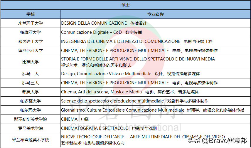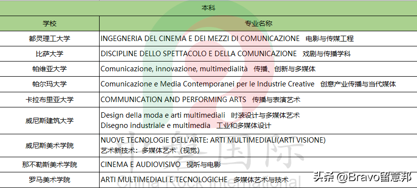 虽然意大利并没有播语音主持和编导的专业,但是有很多综合性大学和美术学院的专业都会涉及到这个类别的不同方向:电影电视方向、多媒体制作方向、新闻学、DAMS、多媒体艺术与技术等方向。