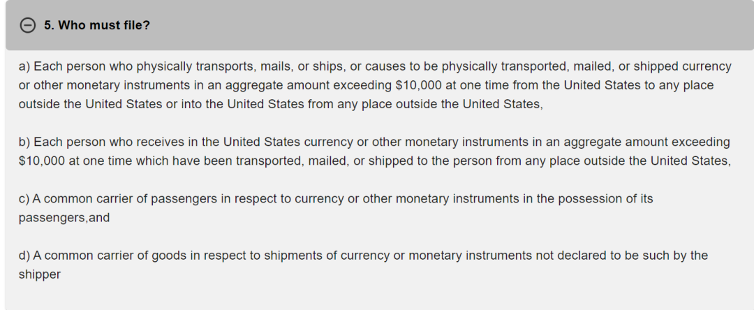 3. 多人入境:多人结伴入境,携带现金/支票总数超过1万美金的需要申报,并填写FinCEN105表格。