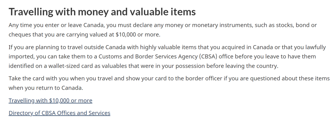 加拿大海关规定,每人可携带(包括随身携带以及存放在本人名下所有行李内的所有货币)少于1万加元的现金或以其他形式(如支票、旅行支票、银行汇票、股票等)存在的货币入、出境。