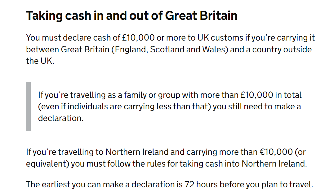 自非欧盟国家入境英国,携带价值1万欧元以上的现金必须向海关申报。