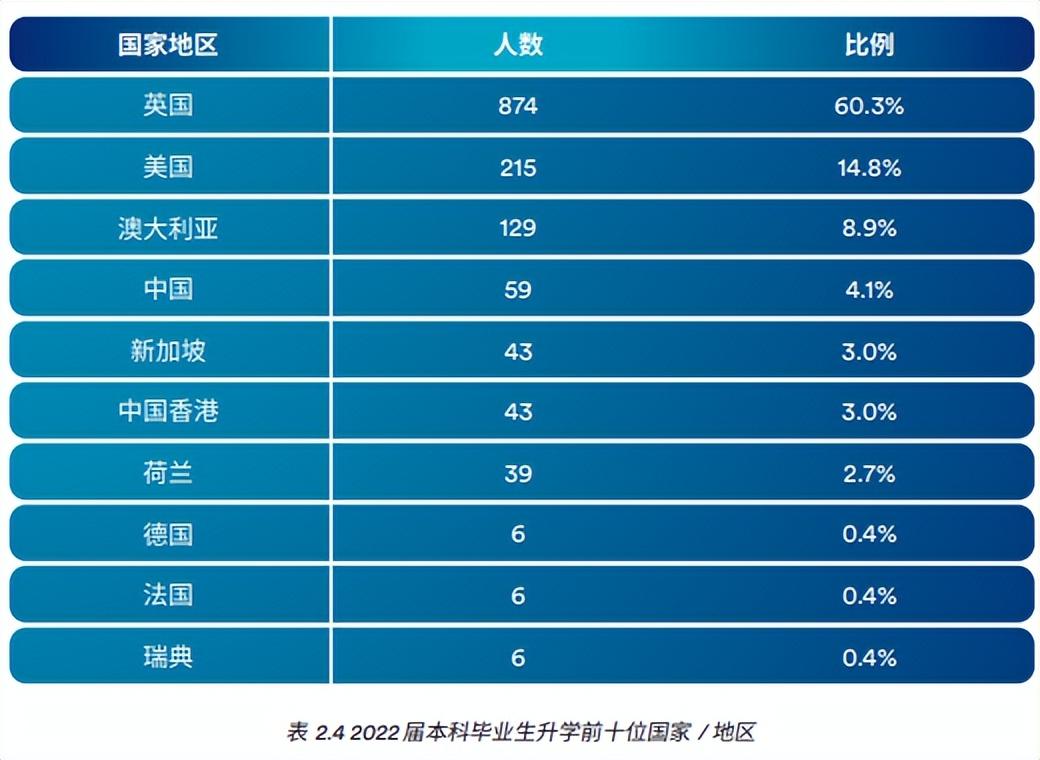 英国G5五所大学的升学人数相加为422人,也就是说选择英国的宁诺毕业生有48.3%去了G5,占将近一半。