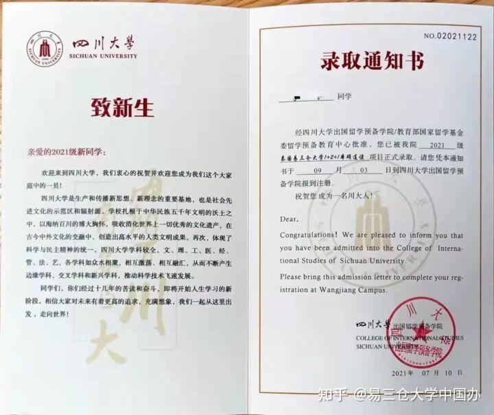 该项目无需参加高考即可加入!由四川大学和泰国易三仓大学直接面试,面试成功后直接由四川大学发放录取通知书。以下是今年的学生收到的录取通知书图片