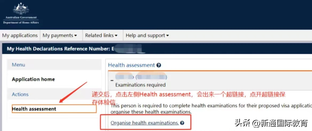 完成在线提交后,您的申请将显示在您的申请列表中,点击左侧健康评估,会弹出超链接,点击下载体检信,点击Save and Print Referral Letter,即可 跳出体检信并保存,根据体检信右上角的HAP ID预约体检!