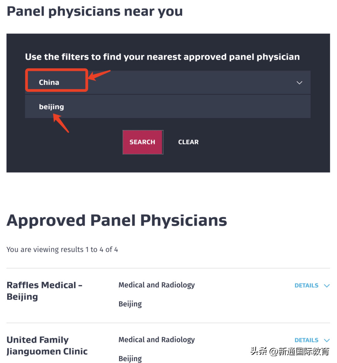 选择国家,可以在关键词输入你所在的城市,就会出来移民局制定的体检中心的名单: