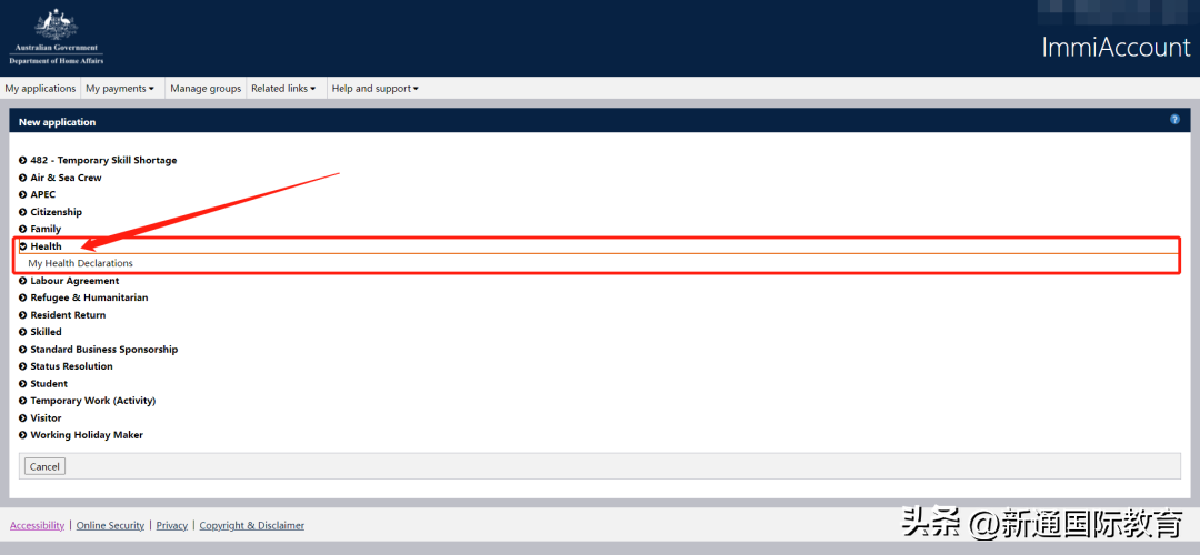 选择My application——New Application-->Health——My Health Declarations