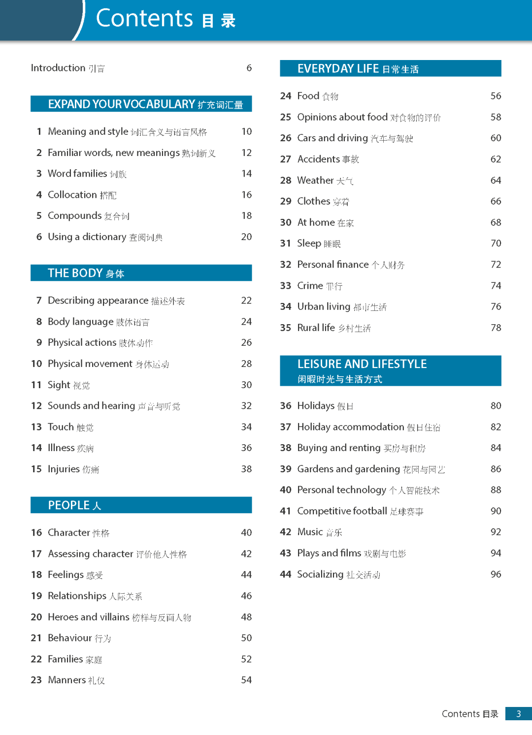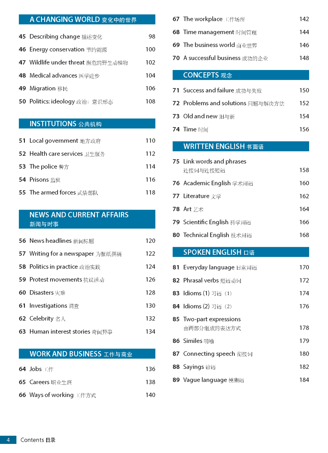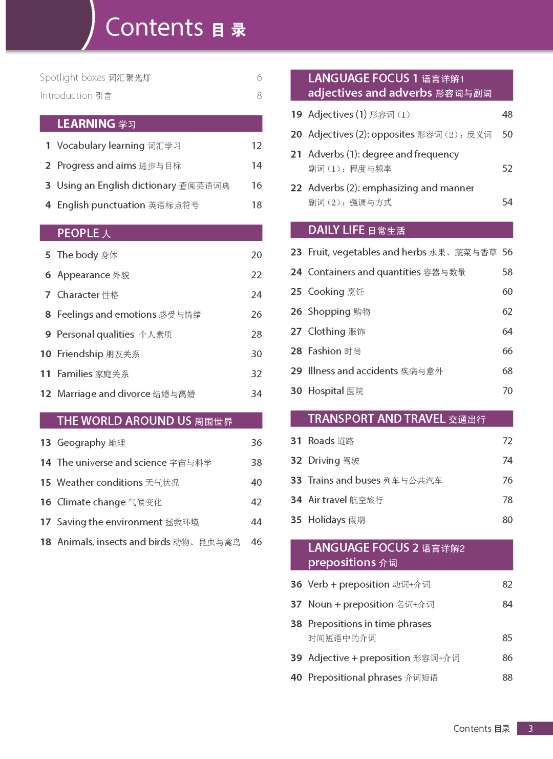 这套书从“日常话题”和“语言本身”出发,将单词和短语按照不同的主题分类,既涵盖了各类社交场合会谈到的话题,又穿插对相关词法和语法的讲解,还包含各种常用的书面语、习语…… 并且每册第一章提供对应水平的学习方法建议,为自学者指明了方向。