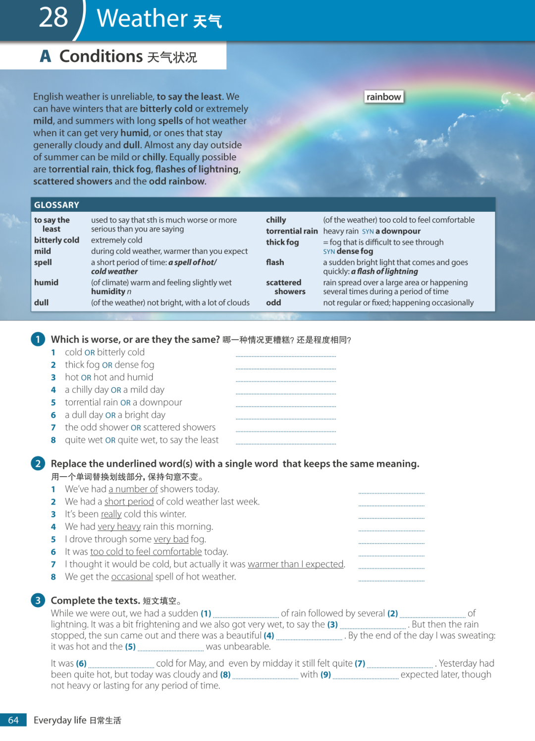 从初级到高级,“天气”这一主题也从选词角度到呈现方式再到练习题型都不断深入。
