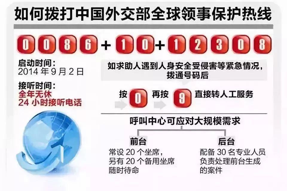 除使领馆的领保专线外,中国公民在海外遭遇突发情况紧急求助,还可拨打外交部全球领事保护与服务应急呼叫中心12308热线。通常情况下,拨打+86-10-12308或+86-10-59913991即可。如求助人在国外遇到人身侵害等紧急情况,拨通号码后可以按“0”再按“9”直接转人工服务。