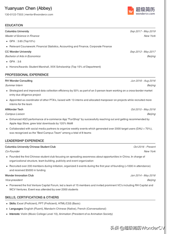 模块顺序:学生的英文简历应该「教育经历」在前,1年工作经验以上的应该「工作经历」在前。如果有特别想突出的教育经历或者工作经历,也可以把对应的内容适当提前。