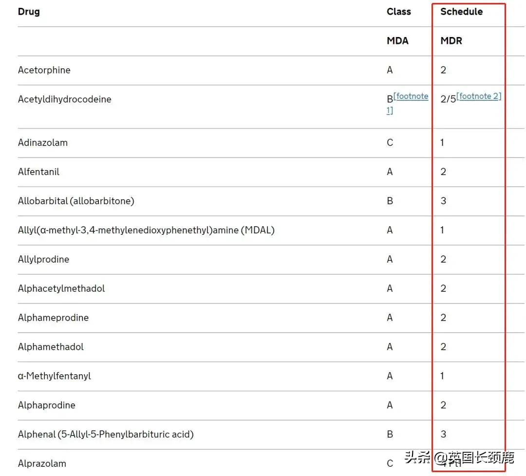根据《2001年滥用药物条例》(MDR)规定,每种类别成分又被分为了不同的管制级别(Schedule)。