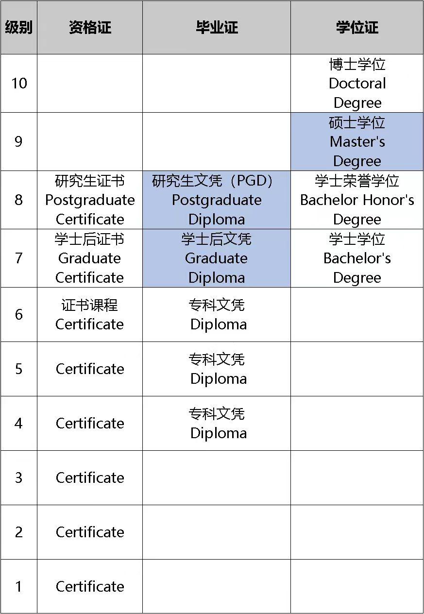 NZQA学历架构将学历划分为10个等级,详情如图:
