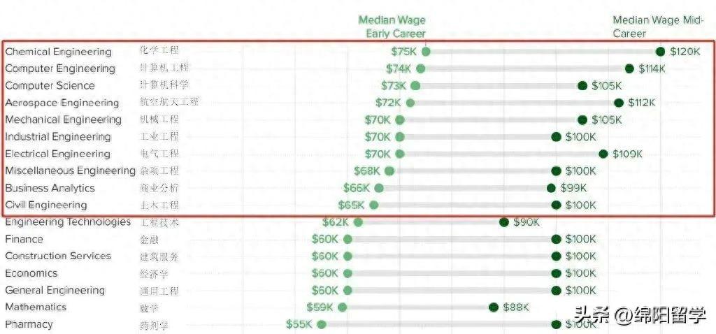 美国本科毕业的学生薪资中位数约5.2万美元/年,但工程类毕业生平均工资为6万美元/年,且不少专业可以轻松突破7万美元大关。不仅如此,工程专业的失业率也较低,不愁找到合适的工作。