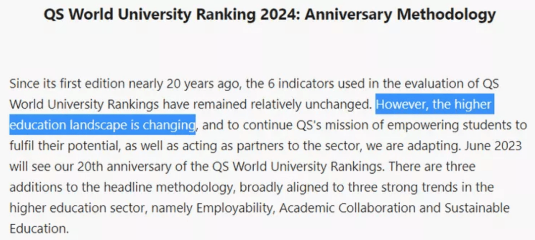 作为公认四大权威世界排名之一的QS,近期,对影响大学排名的指标做了调整。在原有的6项基础指标上,QS又新增了3项,其中一项就是“就业成果”(“毕业生就业率”和“校友成果指数”),占比5%。
