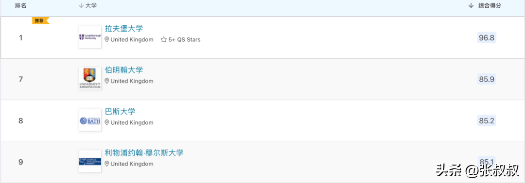 除了拉夫堡大学,英国还有三所高校进入Top 10,它们是伯明翰大学(第7)、巴斯大学(第8)和利物浦约翰·穆尔斯大学(第9)。