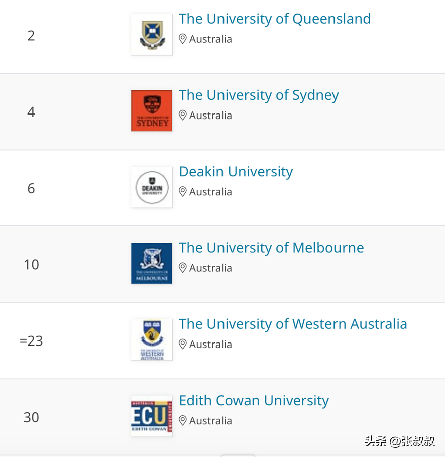 此外,悉尼大学(全球第4)、迪肯大学(全球第6)和墨尔本大学(全球第10)也都表现优异。