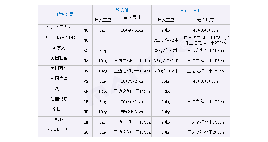 | 尺寸(英寸) | 规格(cm) | 可否登机 | 容量(春秋装) | 出行天数 | 用途 |