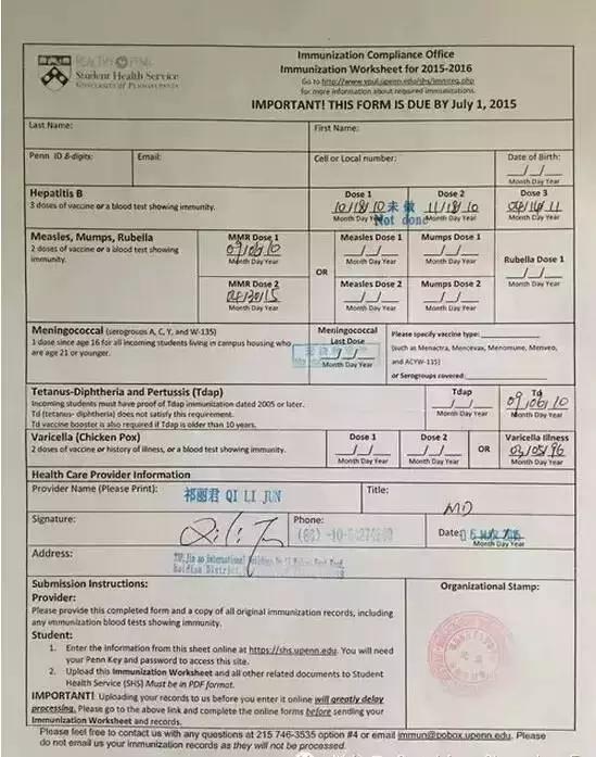 国外学校表格(别的学校不清楚,宾大是有一个requirement一个worksheet,都带上,前台护士会看几眼前者让你选择做哪些,但主要用到的是后者,即填写疫苗表格)