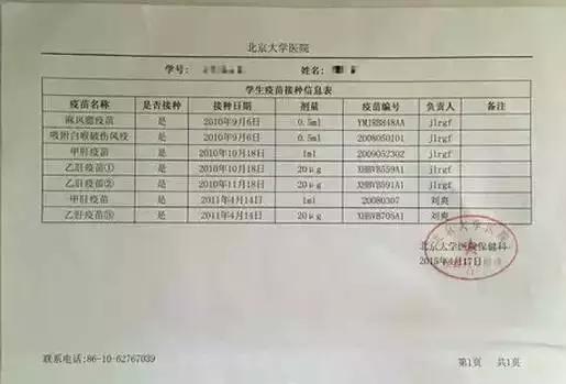 在去体检中心之前,需要准备过往疫苗接种记录。一般来说会有两份,一个是小时候的,一个是本科入学时的。很遗憾我小时候的疫苗本本找不到了,所以只有第二个。北京的高校一般都会让外地新生在入学时接种疫苗,但也是基于自愿,所以你可能打过很多,也可能什么都没打过。去校医院开证明吧。这是我的证明: