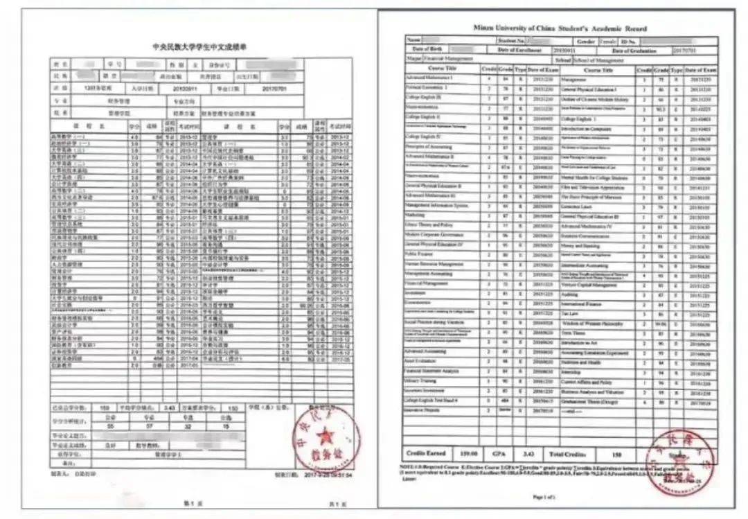 检查中文成绩单中的分数和英文翻译件中是不是每一门都完全一致,学分是不是都相对应。
