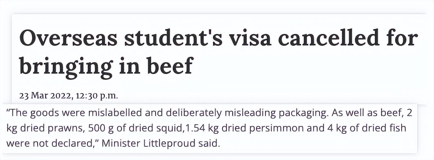 3斤牛肉、4斤虾干、1斤鱿鱼干、3斤干柿子、8斤鱼干……一点食物,至于吗?至于,因为这些食物不仅没有进行申报,而且没有正规的食品包装,是不符合入境规定的。最终被海关罚款2664澳元,取消学生签证并遣返且3年内不能申请澳洲的任何签证……