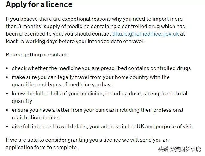如果有其他特殊原因需要携带超过3个月用量的含有受管制药品的处方药,则应该在预定旅行日期前至少15个工作日联系邮箱dflu.ie@homeoffice.gov.uk。