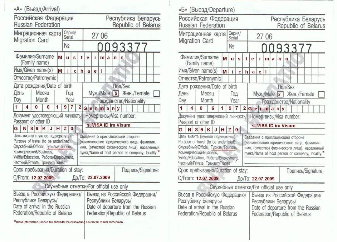 所有进入俄罗斯境内的外国公民都需要填写一份由A表和B表组成的“出入境卡”。其中A表为入境卡,需填写:姓名、出生日期、性别、护照号码、国籍、访问目的、入境起止时间、在俄罗斯的单位名称或居住地址以及需边检人员填写的备注栏。入境卡可在飞机上填写完成,这样可节省出关时间。