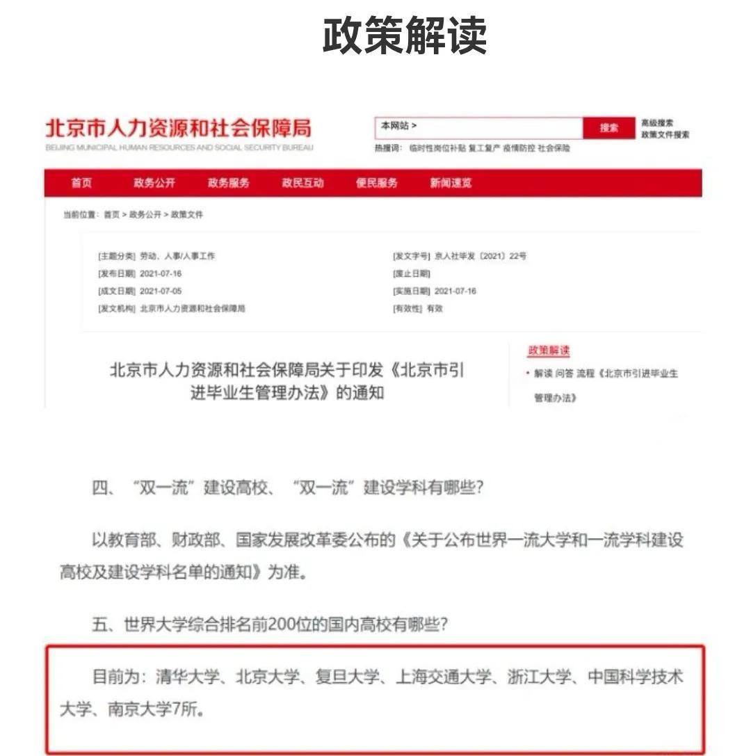2021年7月5日,北京市发布了《北京市引进毕业生管理办法》。《办法》及北京人力资源和社会保障局在“解读问答流程《北京市引进毕业生管理办法》”中提到,清华大学、北京大学、复旦大学、上海交通大学、浙江大学、中国科学技术大学、南京大学本科及以上(7所世界前200高校)、“双一流”建设学科硕士研究生走计划单列渠道,符合一定条件可办理落户。