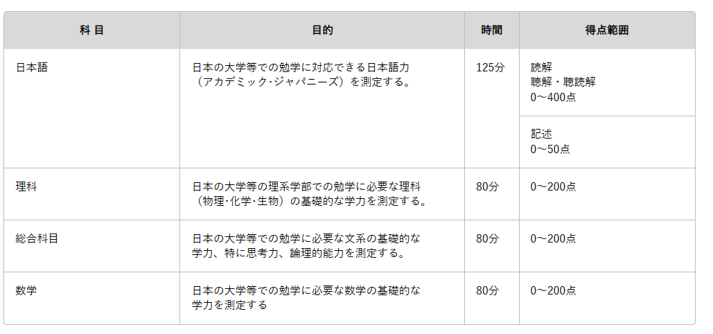 出题语言:日语或英语,考生可以在申请时选择(日语科目的出题语言仅限日语)。不能同时选择理科和综合科目。