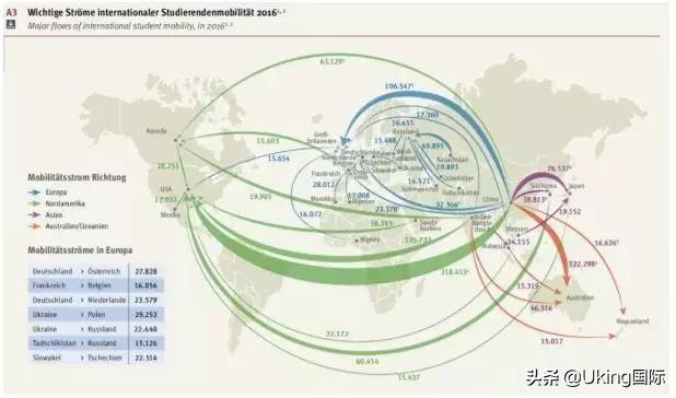 蓝色箭头代表去往欧洲国家的留学生人数,最粗的那一根就是德国留学生啦!