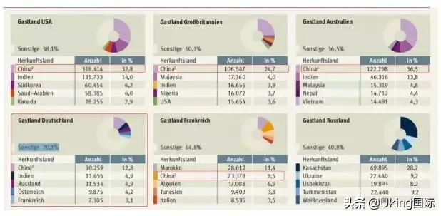 美国的中国留学生占了32.8%;英国24.7%;澳大利亚36.5%;德国12.8%;法国9.5%。