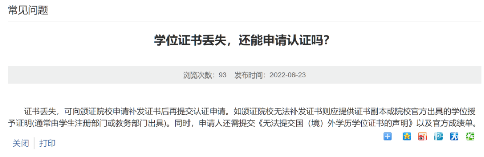 如果文凭丢失,申请认证的同学只能向学校先申请补发证书后,再提交认证申请;如果颁发文凭院校无法补发证书的话,则提供证书副本(可以提前多复印几份),或者院校官方出具的学位授予证明(一般由学校教务部开具),并提供《无法提交国(境)外学位证书的声明》。