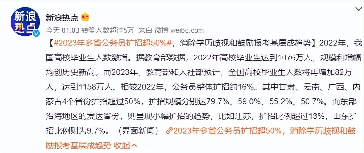 近日,“2023年多省公务员扩招超50%”登上微博热搜。...