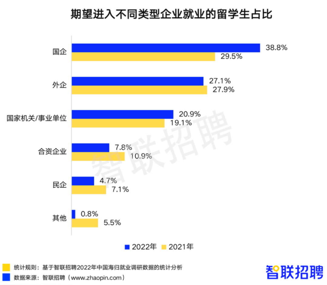 在最近智联招聘发布的《2022中国海归就业调查报告》中,2022年,近四成海归希望进入国企工作,居各类型机构之首,同比增长9%。希望进入外企或国家机构/事业单位的留学生,分别占27.1%、20.9%。