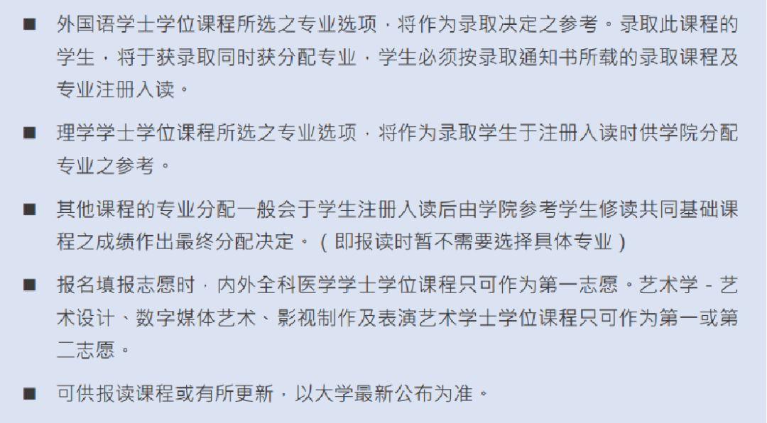 报名填报志愿时,申请人需要填报四个志愿(包括学院、课程及专业之选项)。其中选择报读外国语或理学学士学位课程的申请人必须于「专业」栏位选择具体专业选项: