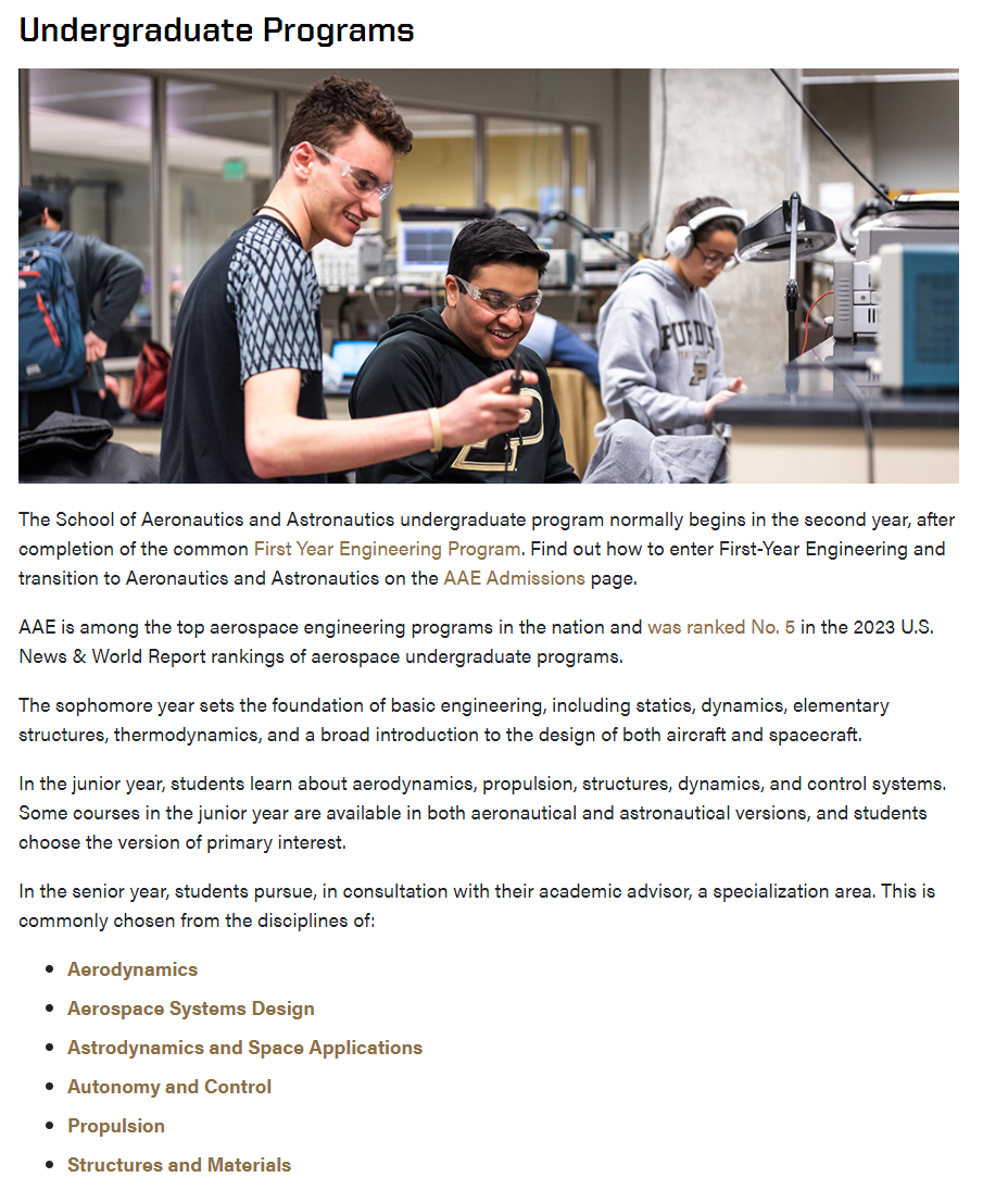 如果你对航天航空学感兴趣,可以考虑Purdue航空航天学院,其本科课程通常在完成普通的一年级工程学课程后的第二年开始。AAE是全美最顶尖的航空航天工程专业之一,在2023年《美国新闻与世界报道》航空航天本科专业排名中位列第5。学生会在大二打好基础工程学的基础,包括静力学、动力学、基本结构、热力学,并广泛介绍飞机和航天器的设计。