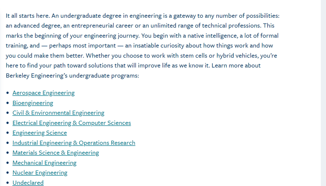 加州伯克利大学是一所世界顶尖的公立大学,该学院的Engineering本科专业在全美排名前列,被誉为美国最好的工程学府之一。