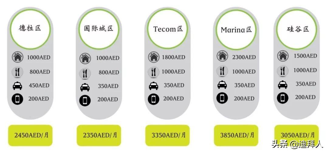 迪拜对于学生校内住宿或者校外住宿并没有太多要求,很多学生考虑到校内住宿的费用相对比较贵,大约在3000迪拉姆双人间的价格,当然具体不同学校的价格也有部分差异。小编为大家准备了迪拜月消费大综合对比,几点说明下,生活费用取决的学生本身,家庭条件好的或者学生有要求另当别论,我们讨论的标配,住宿考虑的是双人间;吃饭结合自己做饭,如果全部在外面吃饭,另当别论,毕竟自己做饭会节省一些;交通主要为去学校的费用,地铁,电车或者公交车;手机话费大致为200迪拉姆,包含话费和3-5GB的流量套餐,我们称之为Emirati Plan,有150,200,250,300,500的套餐,学生可行选择。
