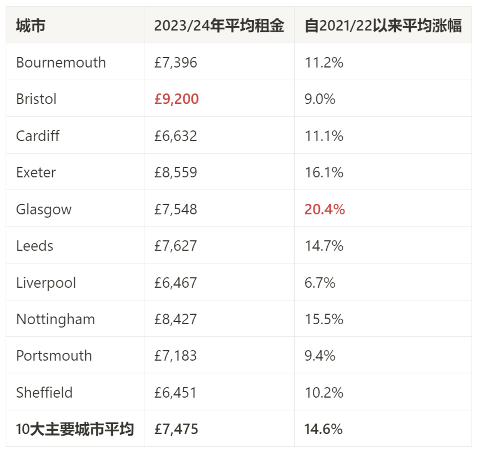 根据Unipol在今年10月26日发布的最新调查显示,英国目前房租租金及涨幅最高的都是房源供应最不足的城市。布里斯托成为除伦敦以外英国目前平均租金最高的城市,达到了每年9200英镑,紧随其后的是埃克塞特(每年8559英镑)和格拉斯哥(每年7548英镑)。