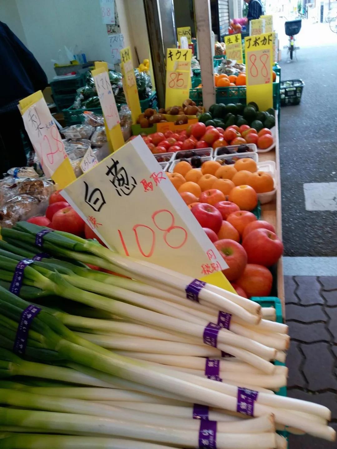 在国人印象当中,日本的蔬菜水果非常贵。但是根据收入来算的话,其实和国内差不多。而且在北京上海等超市买同等质量与新鲜度的蔬菜水果,也不比日本便宜。日本人的基本生活成本与国内比是高还是低,只要此标价除以100,即在倒数两位数前加一个小数点,便一目了然。比如,3根葱108日元相当于国人花1.08元,猕猴桃85日元一个相当于国人花0.85元,牛油果一个88日元相当于国人0.88元,以此类推。以下是大阪市场里的果菜价格,在超市里普遍会比市场贵一些。