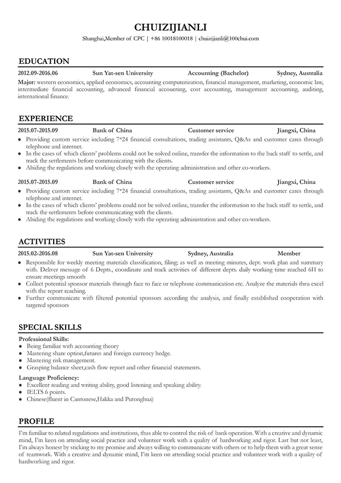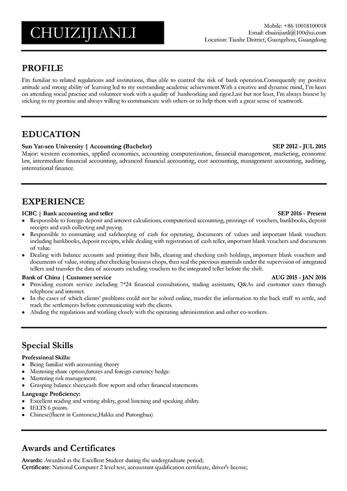 排版要整齐,在第一栏基本信息描述中要包括:姓名+岗位+联系方式+地址,头像不是必须的,如若添加一定是白底/蓝底职业风照片。
