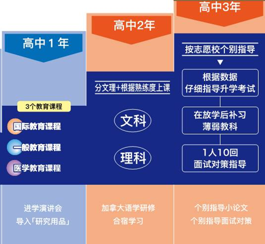 朝日塾中等教育学校在高一分了3个教育课程,分别是:国际教育课程、一般教育课程、以及医学教育课程,大家可以自由可以选择其中任意一个。